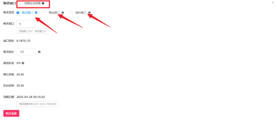 端口购买,增加,数量5个起,根据需要在线充值购买,显示对应端口价格